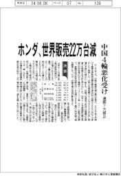 ホンダ、世界販売22万台減 中国4輪悪化受け 通期下方修正