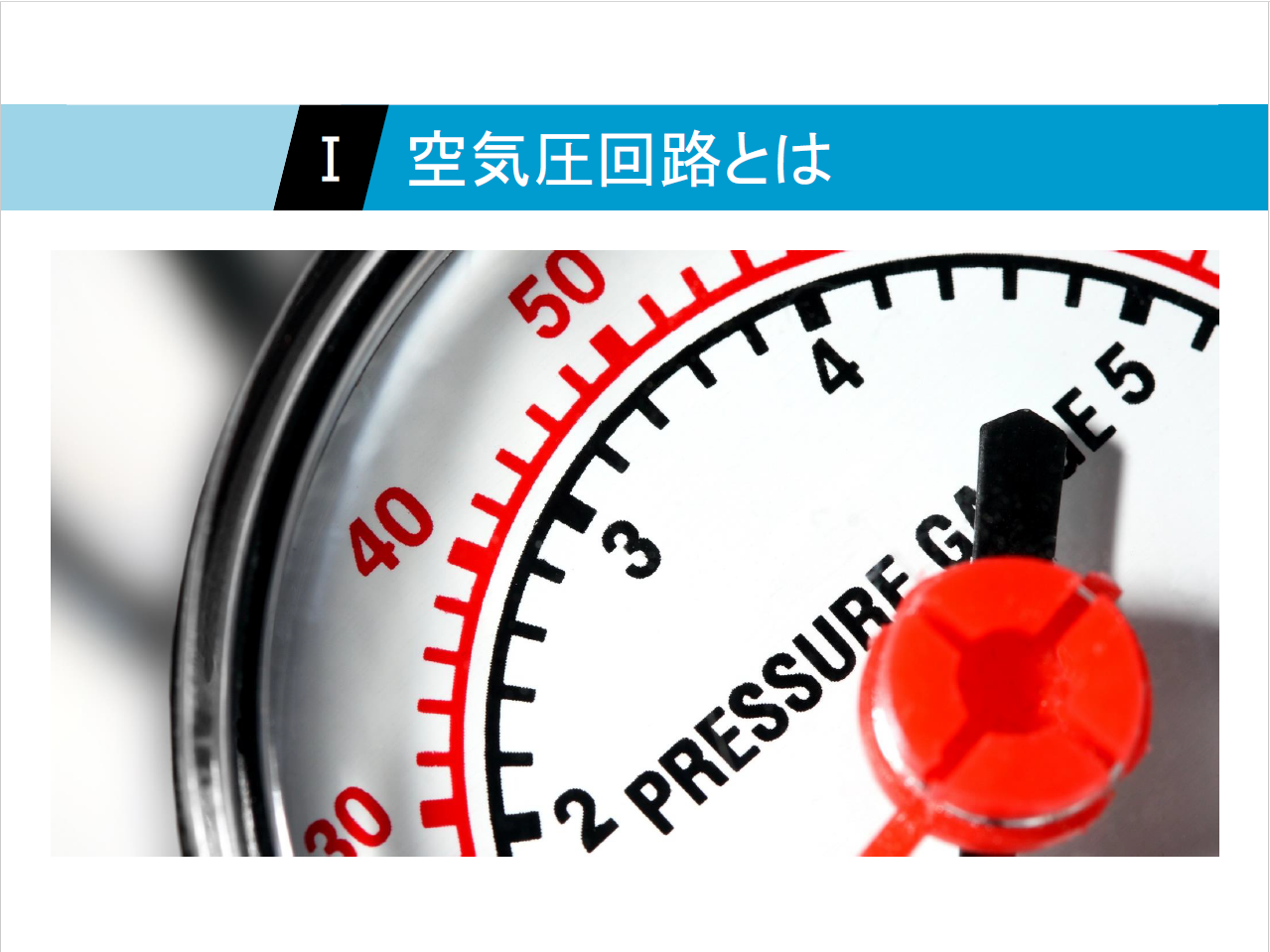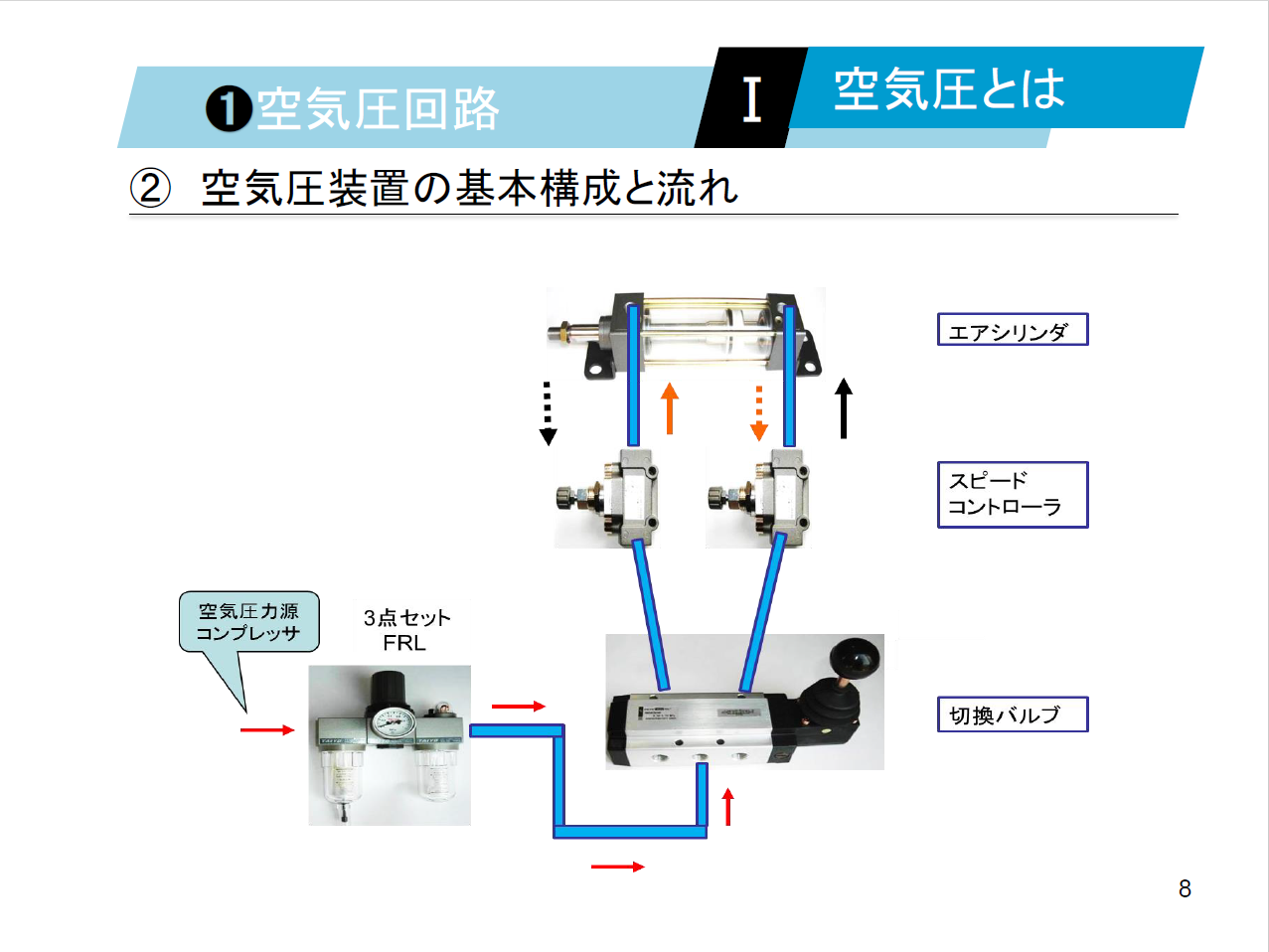 空気圧回路の基本的な構成とながれから理解し、動力源から制御部品までの働きと動作を基本知識として学びます。